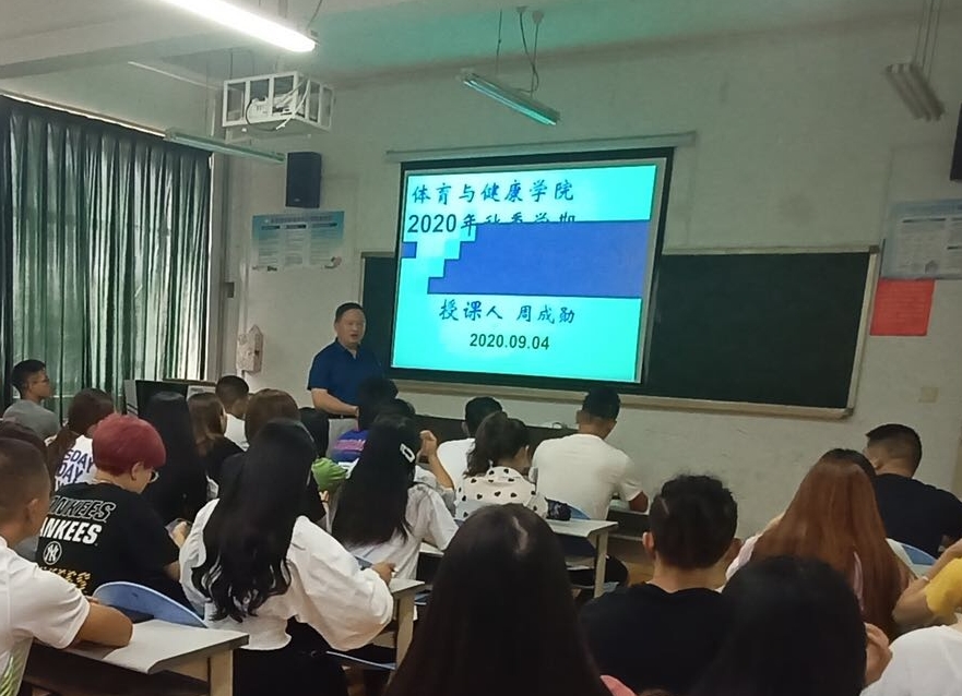 陈强院长在9月4为2017级社会体育指导与管理2班学生进行“开学第一课”教育。课程以“新学期,新要求”为主题,从家国、德礼、新信三个角度,传递新时代青年爱国、遵纪、新思维的价值理念。课堂上,陈院长讲述了一个个在抗击新冠肺炎疫情过程中涌现出的感人至深的抗疫故事,给同学们上了一堂深动、难忘的爱国主义教育课。他教育同学们:要把自己的人生同民族的命运紧密联系在一起,把爱国之情,报国之恋融入实际行动中。作为新时代青年,要崇尚科学,刻苦学习,恪守诚信,崇德明礼,开拓创新,勇攀高峰,要把社会主义核心价值观融入到生活的方方面面,做一个对社会有用的人。