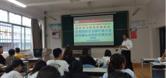 6月29日晚上7点钟,党委书记周成勋按照党史学习教育宣讲计划,在10号教学楼301教室为2018级两个专业学生开展题为《从党的历次全国代表大会的贡献认识党的发展历史》党史学习教育专题宣讲活动,2018级体育教育专业和社会体育制度与管理专业学生近百人听取宣讲。