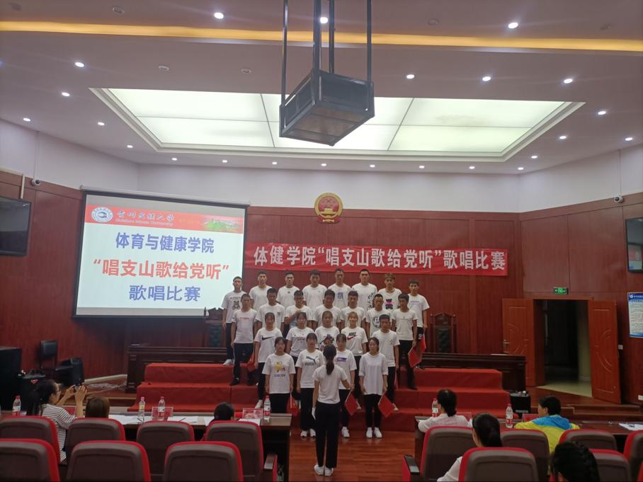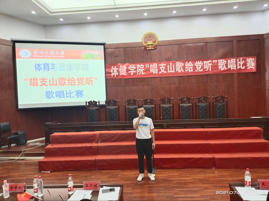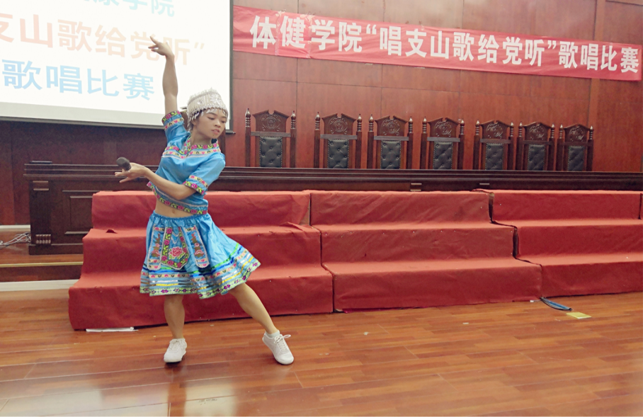 接下来是个人演唱,来自2019级的韦修凤同学身着民族服装,载歌载舞,献唱《山水贵客》带领同学们感受贵州的热情豪迈。2020级的万水龙同学歌唱《我和我的祖国》,2019级郑维刚同学歌唱《国家》,同学们以不同的形式,相同的情怀歌颂伟大中国共产党100年取得的辉煌成就,表达自己对党的热爱之情。