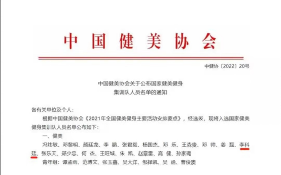 2022年3月24日,中国健美协会正式公布国家健美健身集训队名单,其中我校体育与健康学院2020级硕士研究生李科廷成功入选。